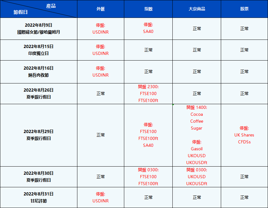 您好,受即將到來的八月份假期影響,PU Prime的交易時間將有所調整。